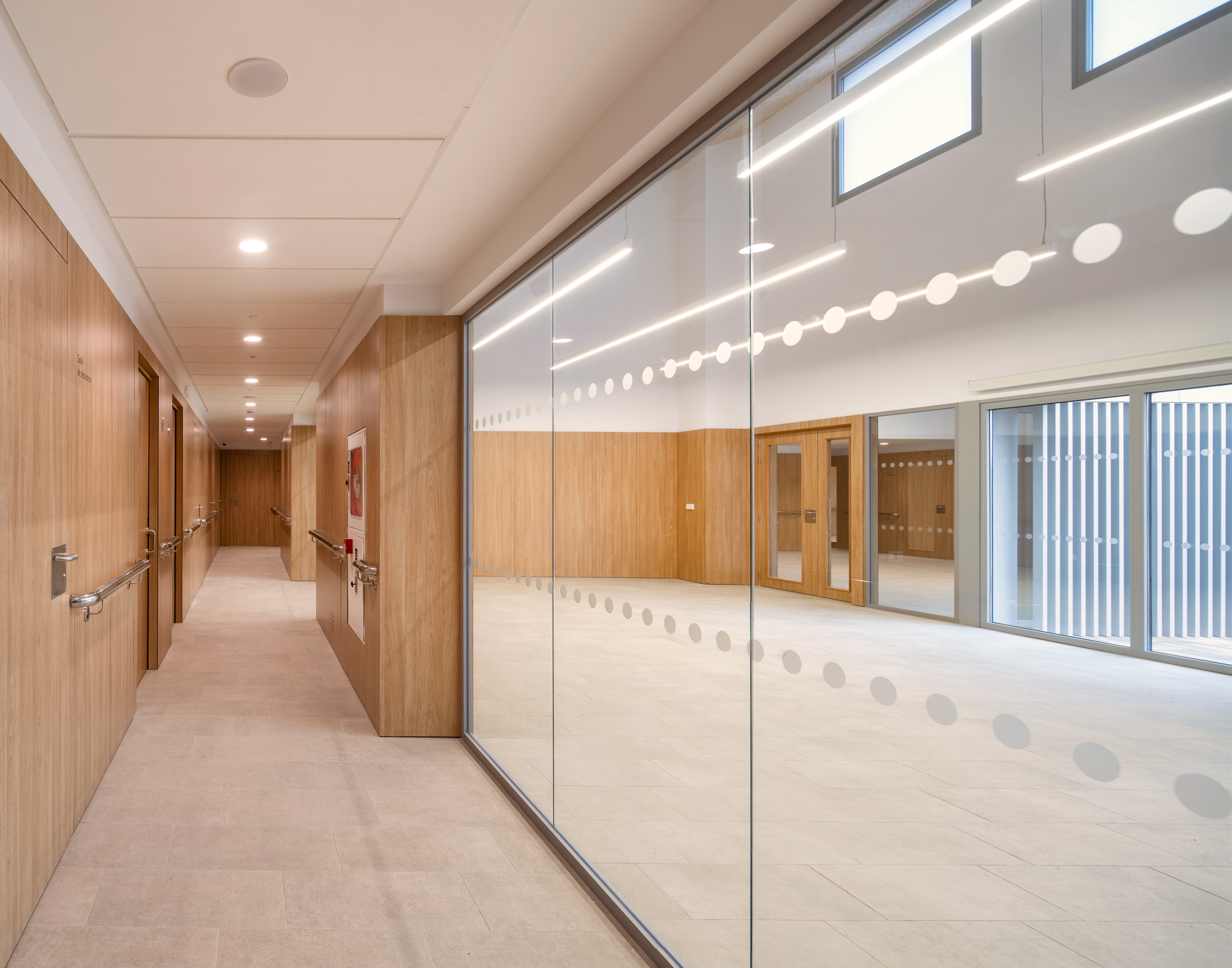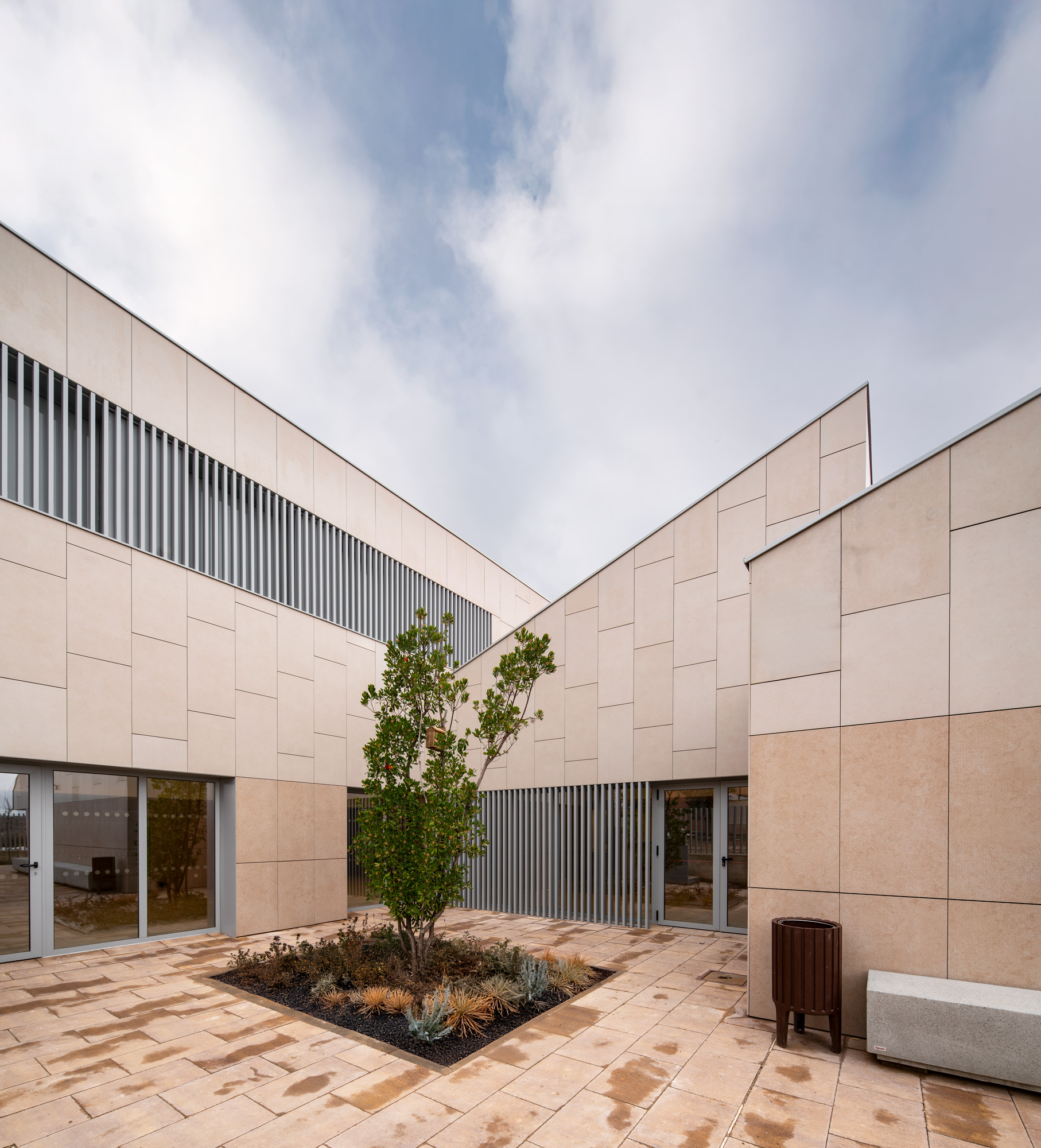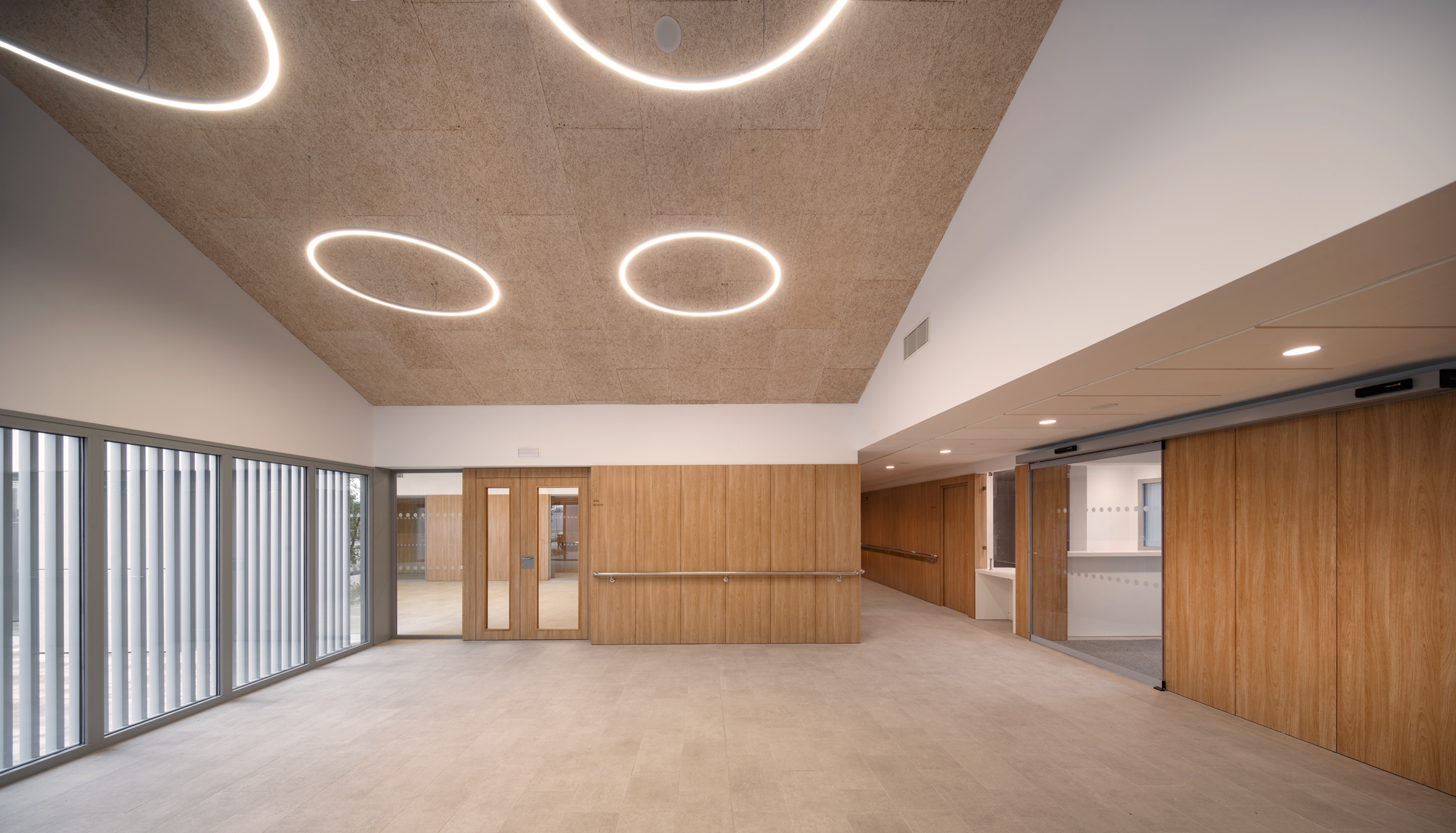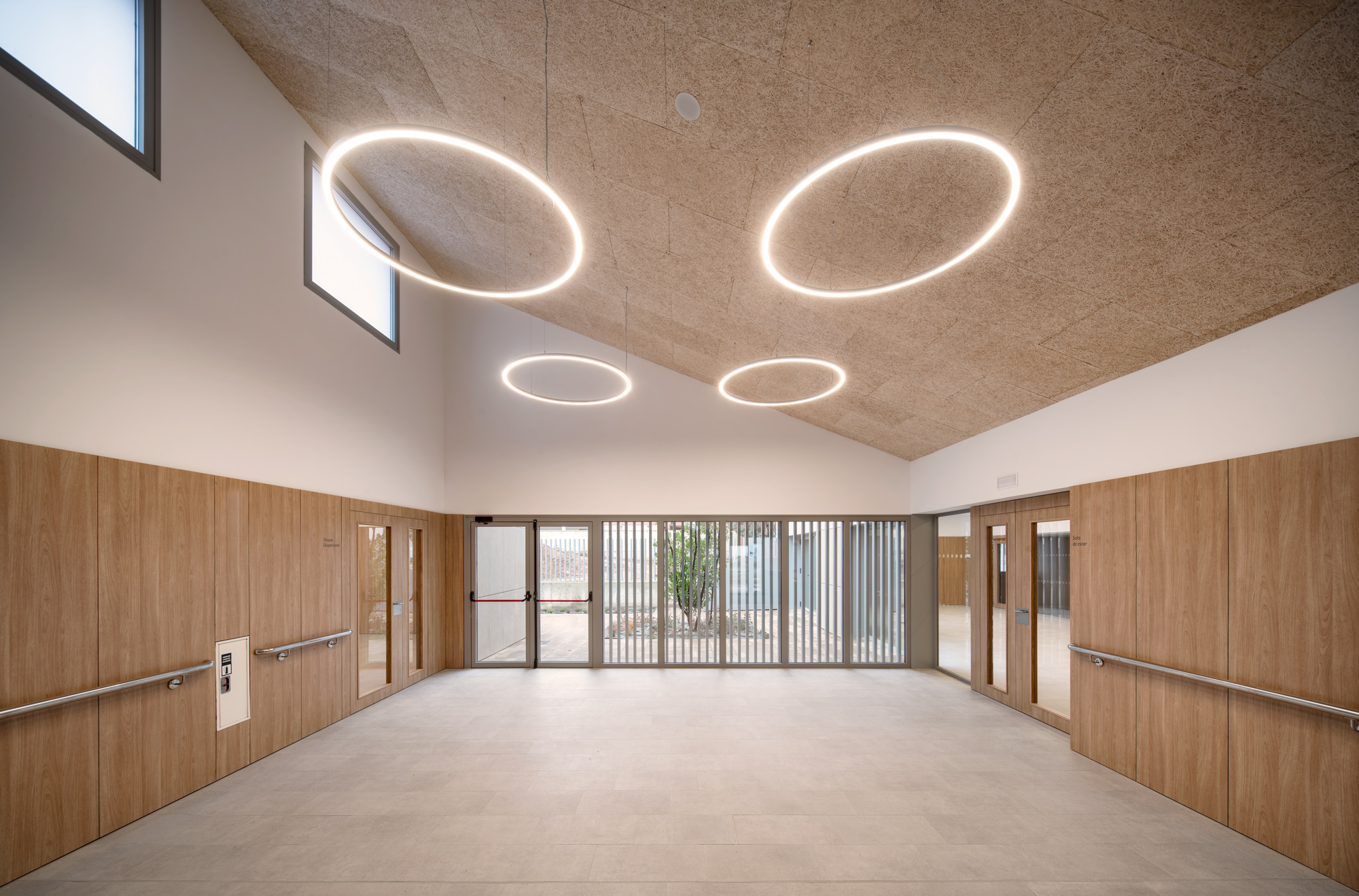 Desde el punto de vista funcional, el edificio se organiza de manera clara e intuitiva, priorizando recorridos accesibles, iluminación natural abundante, control acústico y una relación fluida entre espacios interiores y exteriores. Estos principios, avalados por investigaciones recientes en arquitectura geriátrica, contribuyen a mejorar la calidad de vida, reducir el estrés y fomentar la socialización y la actividad diaria.