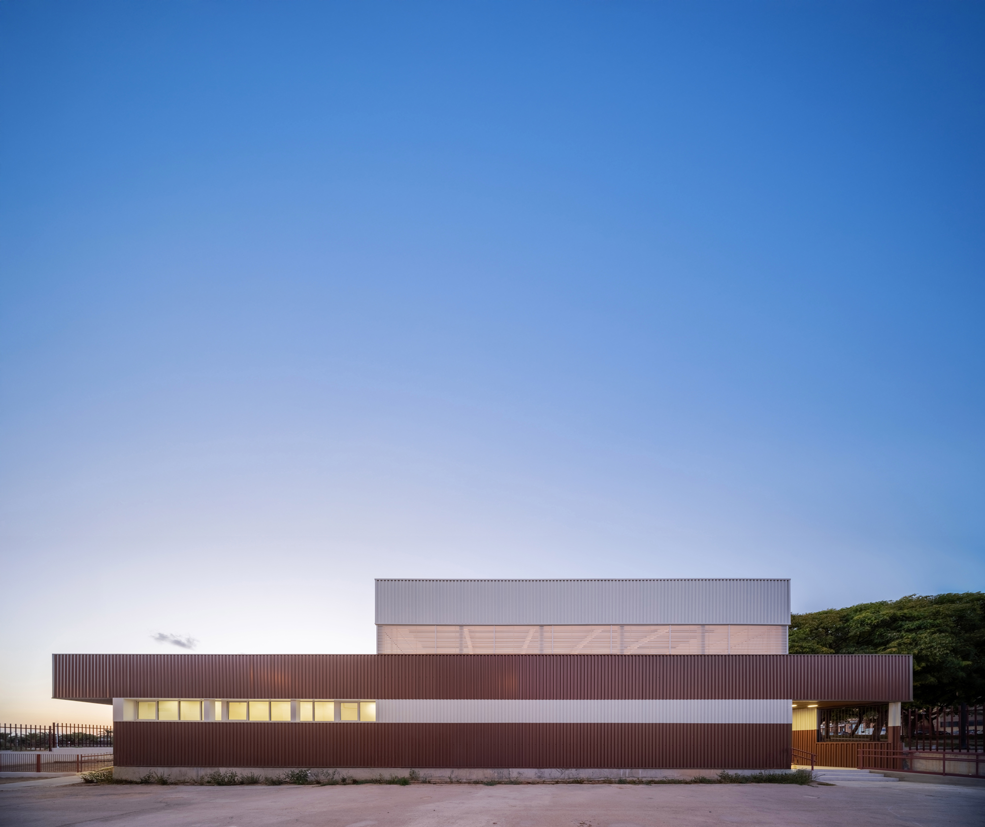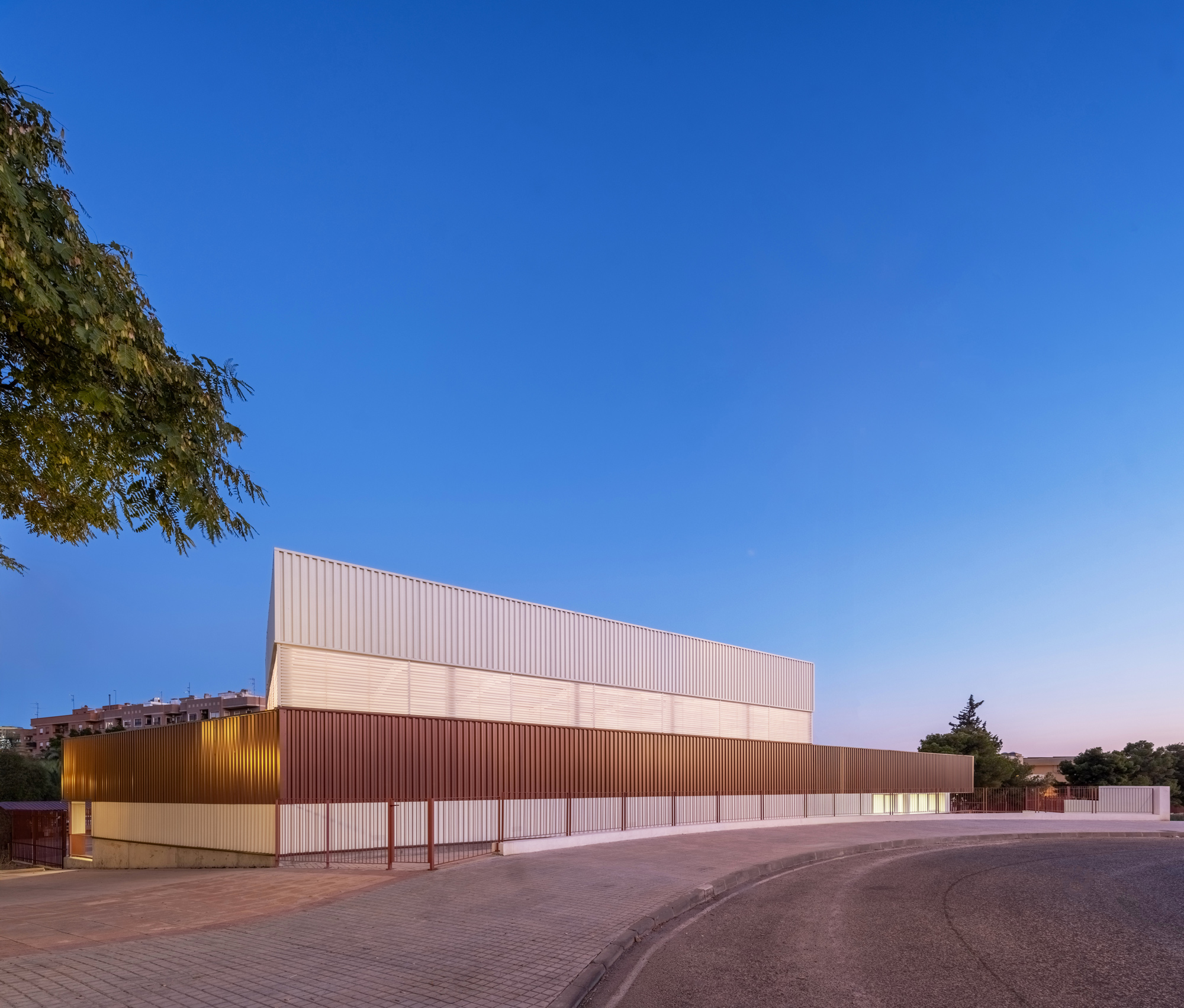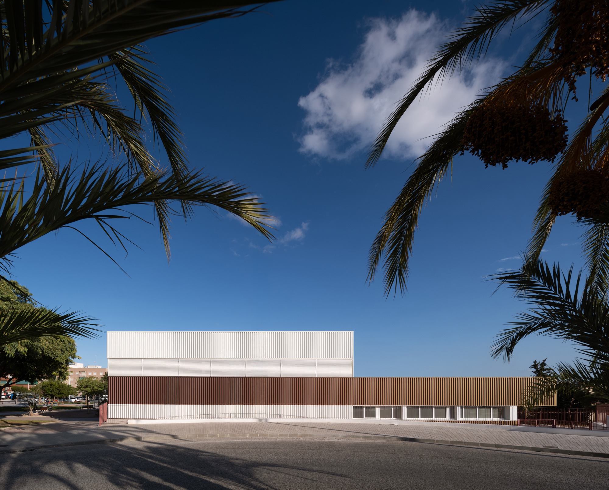 La envolvente se resuelve con una chapa metálica tornasolada, dispuesta en bandas infinitas, que cambia de color según la luz, la posición del sol o la presencia de nubes. El edificio se percibe así muy contemporáneo y casi difuso, vibrando con el cielo de Elche y haciendo visible el carácter público y actual del centro.